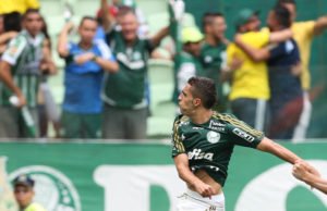 Gabriel comemorando seu primeiro gol pelo Palmeiras. (Foto: Cesar Greco / Fotoarena)