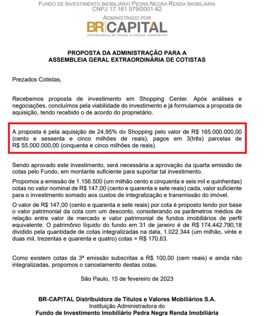 O “Fundo de Investimento Imobiliário Pedra Negra Renda Imobiliária ” é administrado pela empresa BR Capital. Ele possui, entre seus ativos, alguns imóveis comerciais em Belo Horizonte (como o hotel Renaissance), na região da Savassi, e também em Itaúna.