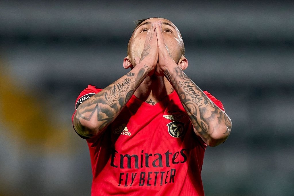 PACOS DE FERREIRA, PORTUGAL - APRIL 10: Everton Sousa 'Cebolinha' of SL Benfica reacts during the Liga NOS match between FC Pacos de Ferreira and SL Benfica at Estadio Capital do Movel on April 10, 2021 in Pacos de Ferreira, Portugal. Sporting stadiums around Portugal remain under strict restrictions due to the Coronavirus Pandemic as Government social distancing laws prohibit fans inside venues resulting in games being played behind closed doors. (Photo by Jose Manuel Alvarez/Quality Sport Images/Getty Images)