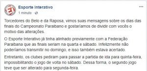 Os jogos da final inicialmente seria na quarta-feira e no domingo. Mas a Esporte interativo, a emissora detentora dos direitos de transmissão, acertou com a Federação Paraibana de Futebol (FPF), para quarta-feira e sábado.