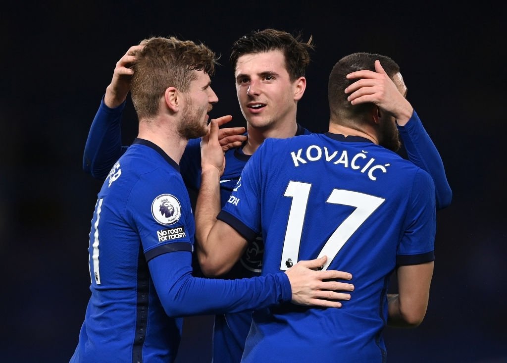 LONDON, ENGLAND - FEBRUARY 15: (L-R) Timo Werner of Chelsea celebrates with teammates Mason Mount and Mateo Kovacic after scoring their team's second goal during the Premier League match between Chelsea and Newcastle United at Stamford Bridge on February 15, 2021 in London, England. Sporting stadiums around the UK remain under strict restrictions due to the Coronavirus Pandemic as Government social distancing laws prohibit fans inside venues resulting in games being played behind closed doors. (Photo by Darren Walsh/Chelsea FC via Getty Images)