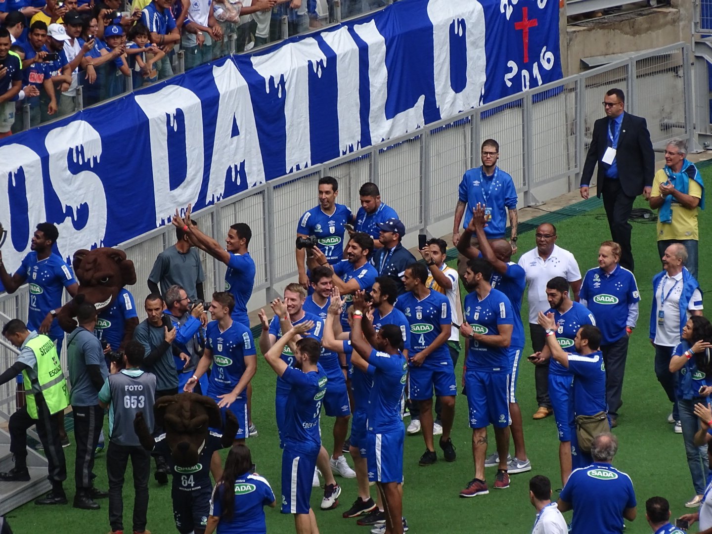 Antes do jogo começar, o time do Sada Cruzeiro, que foi campeão no Vôlei, deu a volta olímpica no estádio.