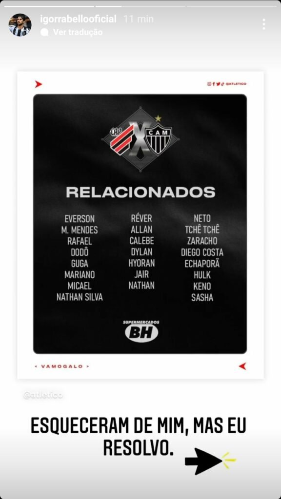 Na tarde dessa segunda-feira (15), o Atlético Mineiro divulgou em suas redes sociais os relacionados para a partida de amanhã (16) diante o Athletico Paranaense na Arena da Baixada. O jogo é válido pela 32º rodada.