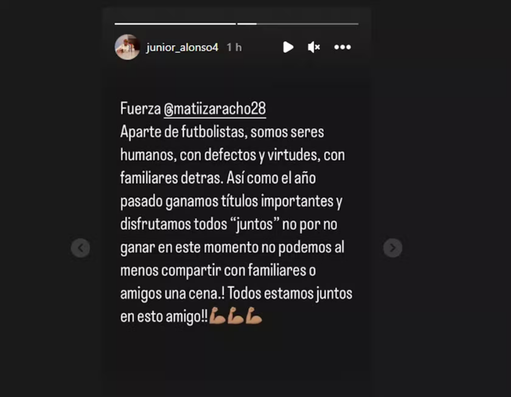“Força, Zaracho. Além de futebolistas, somos seres humanos, com defeitos e virtudes, com familiares por trás. Assim como no ano passado ganhamos títulos importantes e desfrutamos todos juntos, não é porque não estamos ganhando neste momento que não podemos ao menos compartilhar com familiares e amigos um jantar. Todos estamos juntos nisso, amigo!”