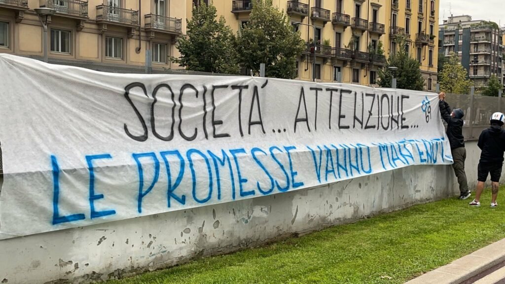 “Conselho, preste atenção, as promessas devem ser mantidas.” diz faixa pendurada aos arredores da sede do clube, em Milão