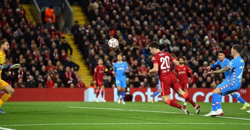 E dessa vez foi com o português Diogo Jota, após bola levantada na área, o atacante surgiu em meio aos três zagueiros do time espanhol e marcou de cabeça, com seus 1,78 de altura.
