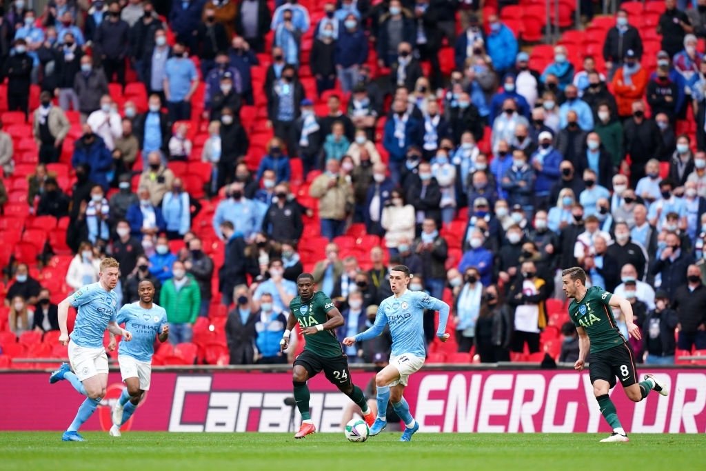 LONDON, ENGLAND - APRIL 25: Phil Foden of Manchester City runs with the ball as Manchester City fans watch on from the stand during the Carabao Cup Final between Manchester City and Tottenham Hotspur at Wembley Stadium on April 25, 2021 in London, England. 8,000 fans are due to watch the game at Wembley, the most at an outdoor sporting event in the UK since the coronavirus pandemic started in March, 2020. Each team has been given an allocation of 2,000 with the remaining tickets split between local residents and NHS staff. (Photo by Matt McNulty - Manchester City/Manchester City FC via Getty Images)