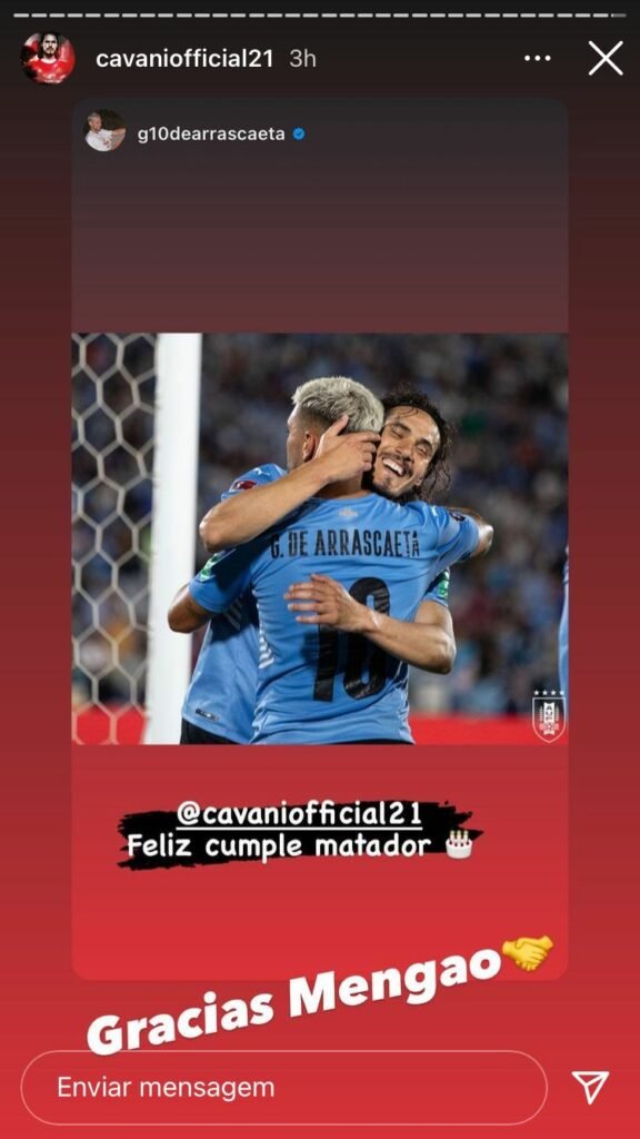 O camisa 14 publicou uma foto com Cavani e o parabenizou por seus 35 anos. Vale lembrar que os dois atuam juntos pela seleção do Uruguai. A Celeste briga nas Eliminatórias por uma vaga para a Copa do Mundo, que acontece ainda neste ano.