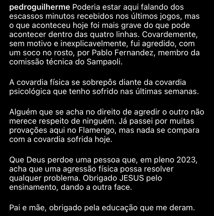 Desde a noite de ontem, Pedro já se manifestou nas redes sociais. O jogador citou perseguição psicológica e afirmou que nada justifica o que aconteceu. Veja abaixo o pronunciamento completo: