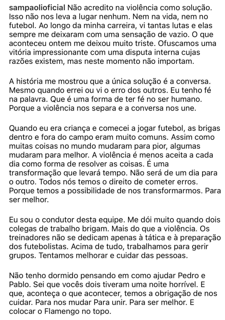Já neste domingo, Sampaoli e seu preparador se manifestaram. Em uma tentativa de jogar panos quentes sobre o acontecimento, o treinador argentino afirmou que lhe doeu ver dois amigos brigando. Além disso, ele disse que tentaria achar uma forma para ajudar os dois envolvidos na confusão. Veja: