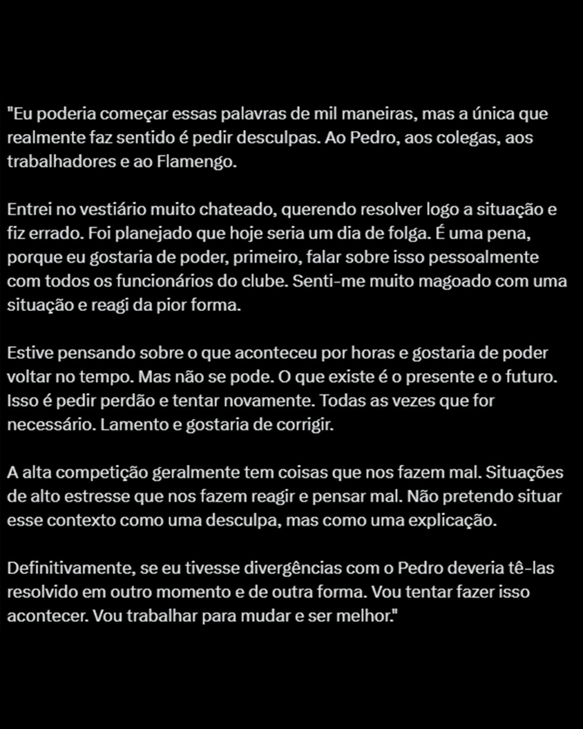 O último a se pronunciar foi o preparador físico, que afirmou se sentir arrependido e querendo voltar no tempo. Pablo se desculpou com Pedro e todos os demais membros do Flamengo.