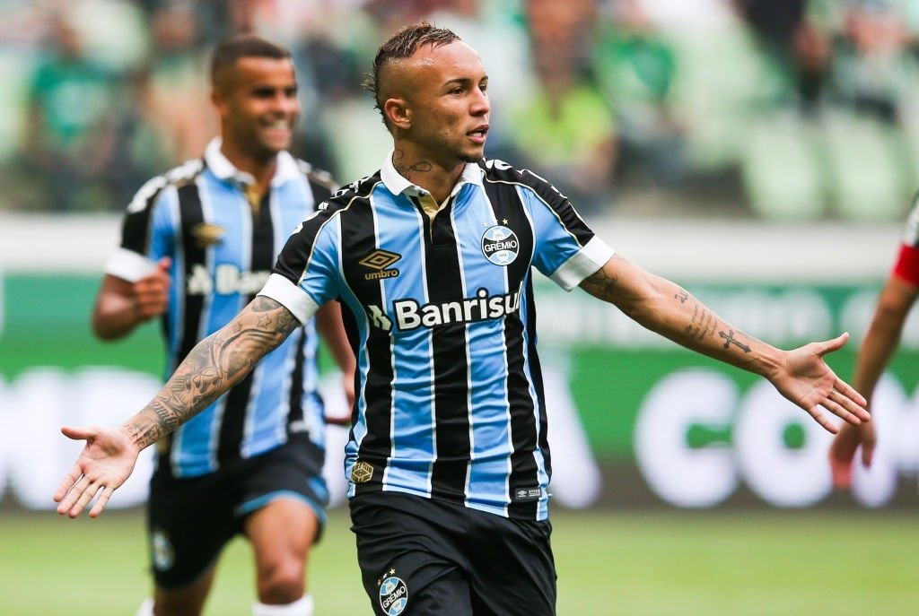 SAO PAULO, BRAZIL – NOVEMBER 24: Everton #11 of Gremio celebrates after scoring the first goal of his team during the match against Palmeiras for the Brasileirao Series A 2019 at Allianz Parque on November 24, 2019 in Sao Paulo, Brazil. (Photo by Alexandre Schneider/Getty Images)