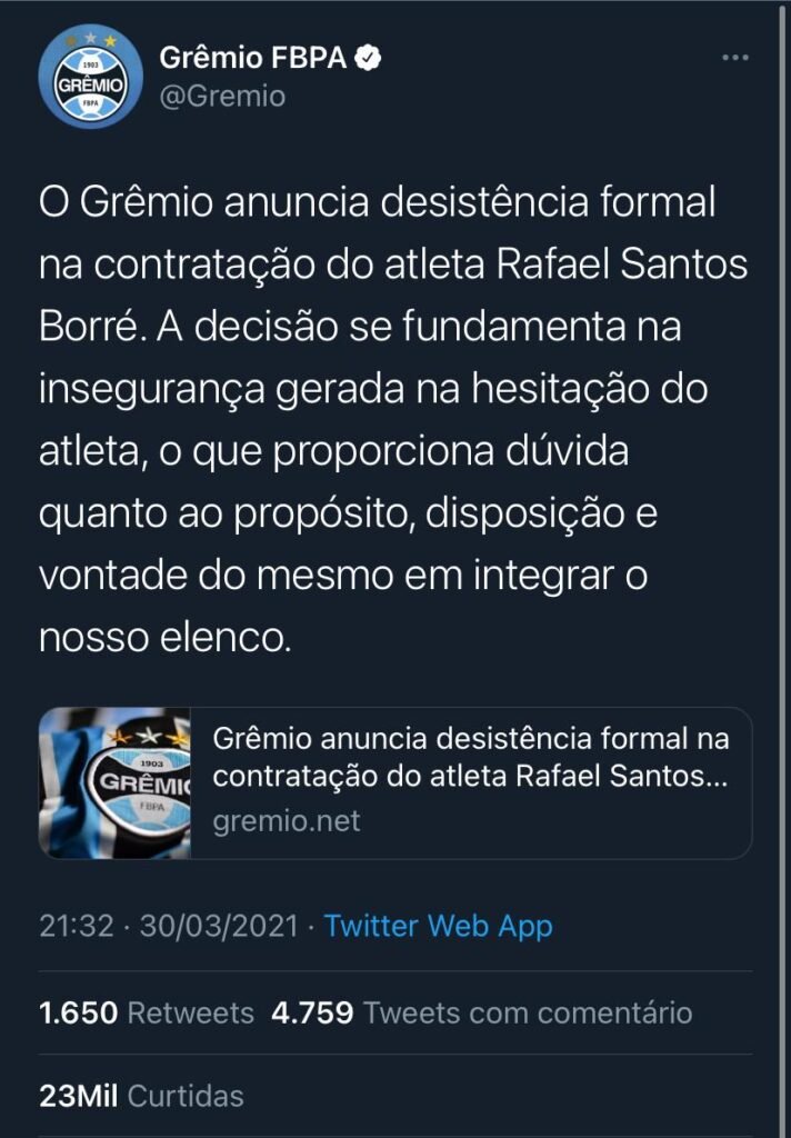 Na última terça-feira (30) o Grêmio se posicionou oficialmente no Twitter desistindo da contratação de Borré.