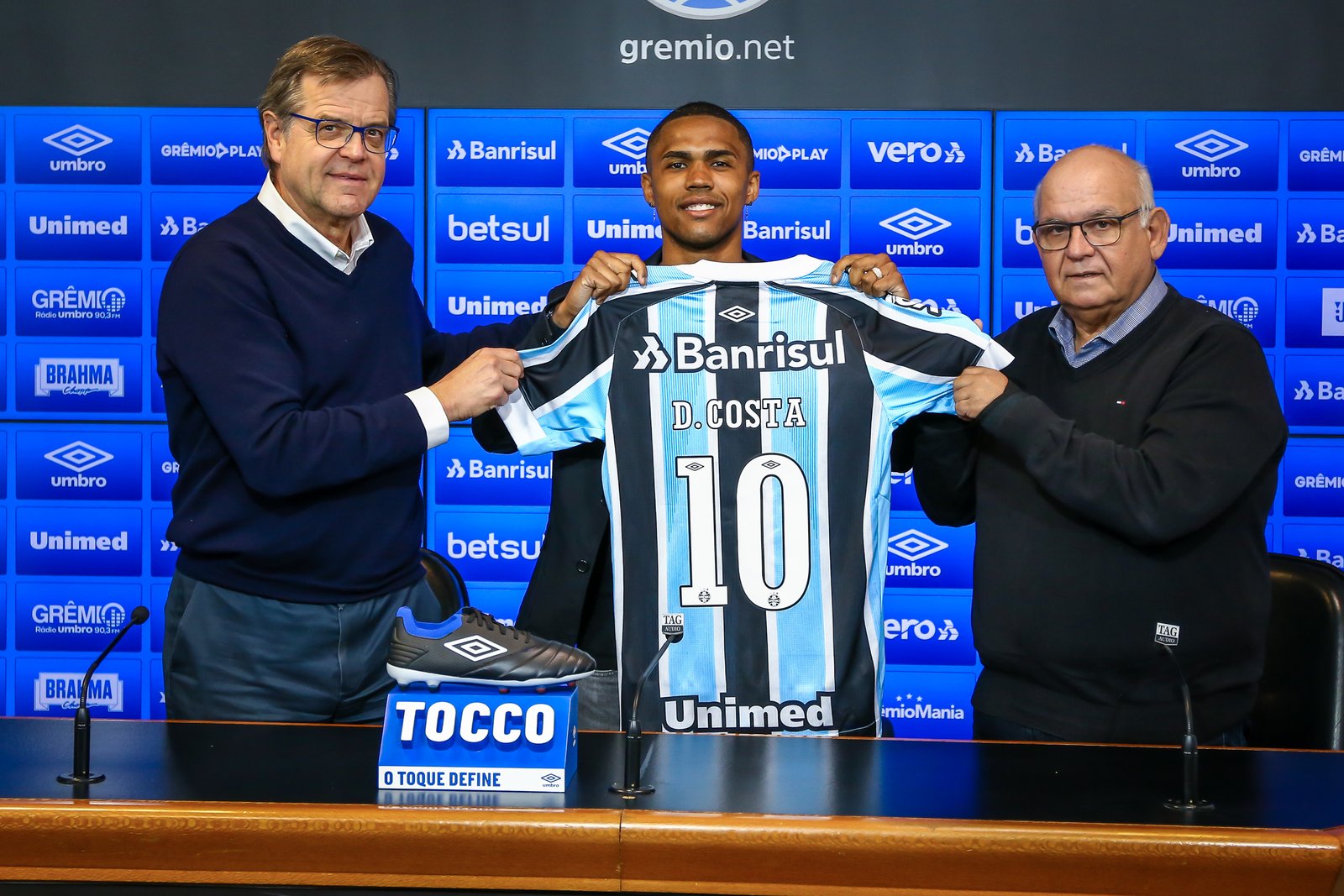 RS - FUTEBOL/APRESENTACAO GREMIO - ESPORTES - Presidente Romildo Bolzan Junior, ao lado do vice-presidente Marcos Herrmann, apresenta o atacante Douglas Costa como reforço do Gremio para a temporada 2021. FOTO: LUCAS UEBEL/GREMIO FBPA
