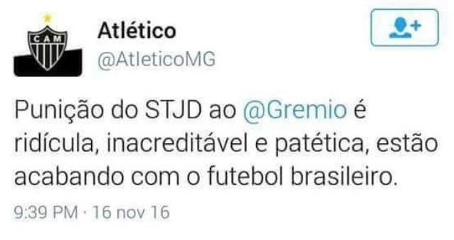 Em nota oficial do clube, o Grêmio declarou que iria recorrer a punição causada na quarta-feira (16). Muitos comentários, revoltas nas redes sociais foram vista após a decisão do STJD, onde famosos e até o clube do Atlético Mineiro lamentaram essa decisão e o ponto que chegou. Veja: