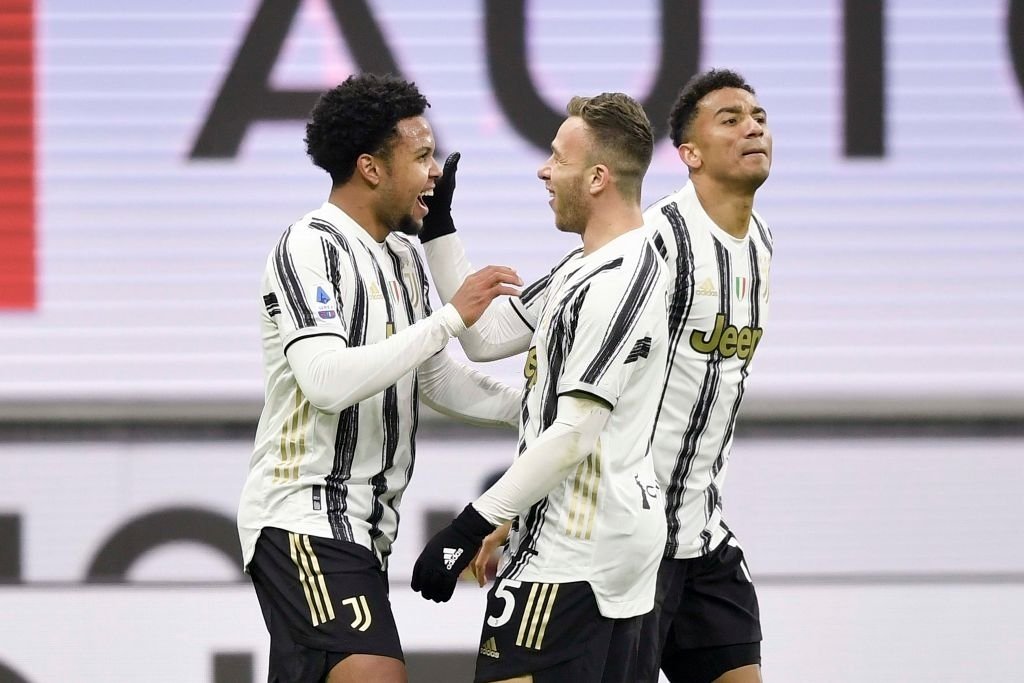 MILAN, ITALY - JANUARY 06: Weston McKennie of Juventus celebrates after scoring his team's third goal with teammates Arthur Melo and Danilo during the Serie A match between AC Milan and Juventus at Stadio Giuseppe Meazza on January 06, 2021 in Milan, Italy. Sporting stadiums around Italy remain under strict restrictions due to the Coronavirus Pandemic as Government social distancing laws prohibit fans inside venues resulting in games being played behind closed doors. (Photo by Daniele Badolato - Juventus FC/Juventus FC via Getty Images)