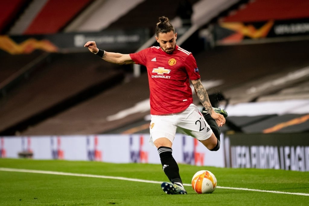 MANCHESTER, ENGLAND - APRIL 15: Alex Telles of Manchester United in action during the UEFA Europa League Quarter Final Second Leg match between Manchester United and Granada CF at Old Trafford on April 15, 2021 in Manchester, United Kingdom. Sporting stadiums around Europe remain under strict restrictions due to the Coronavirus Pandemic as Government social distancing laws prohibit fans inside venues resulting in games being played behind closed doors. (Photo by Ash Donelon/Manchester United via Getty Images)