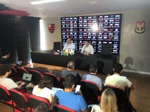 Rodrigo Caetano e Ricardo Lomba falam com os jornalistas