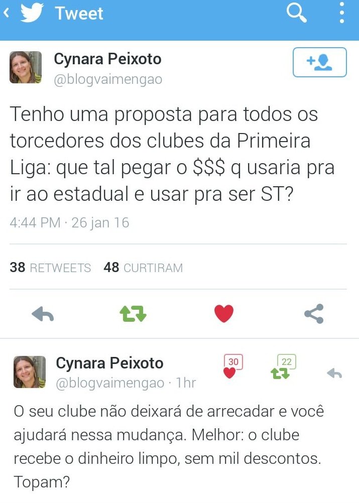 A campanha tem sido tão forte que muitas pessoas tem dado ideias para mostrar que podemos fazer o nosso clube ser beneficiado e prejudicar a federação. Um exemplo é Cynara Peixoto, que em sua conta no twitter publicou: “Tenho uma proposta para todos os torcedores dos clubes da Primeira Liga: que tal pegar o $$$ q usaria pra ir ao estadual e usar pra ser ST?” Com isso o dinheiro iria todo pro Flamengo e não prejudicaríamos o clube, boicotando o campeonato. E vale uma informação a quem é sócio torcedor ou quer entrar pra nação rubro-negra. O Flamengo está fazendo a seguinte promoção : O sócio que indicar um amigo ao ST ( em qualquer plano) e o amigo se cadastras, ambos vão ganhar a terceira camisa do ano passado. Quem é sócio basta olhar em seu email, o Flamengo enviou um código que deve ser inserido no cadastro do indicado.