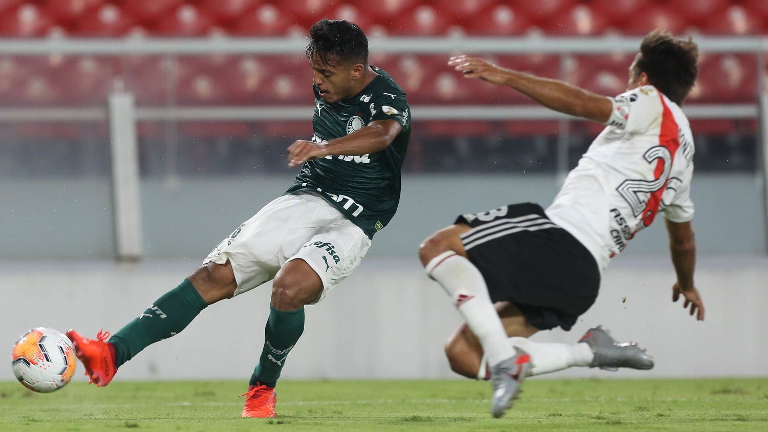 O River, por sua vez, começou o jogo como sempre: intenso. Pressionou o Palmeiras até obrigar Weverton a fazer uma boa defesa após chute de Carrascal. Aos poucos, porém, o verdão se achava na partida e equilibrou o duelo. E ao fazer uma linha de cinco na defesa quando não tinha a bola que neutralizava as jogadas ofensivas do adversário. Acuado, os argentinos ficaram nervosos e o Palmeiras viu sua estratégia dar certo.