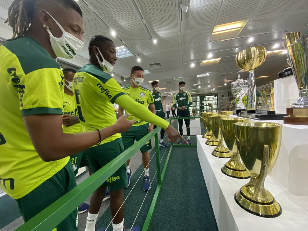 O espaço fica em um dos andares do estádio Allianz Parque. Os atletas e a comissão técnica, liderada por Abel Ferreira, foram, portanto, conhecer as novas instalações. As fotos foram feitas à vontade, pois alguns jogadores, por exemplo, registraram o passeio em suas redes sociais. Os principais personagens das fotografias eram os troféus que o Palmeiras faturou recentemente.
