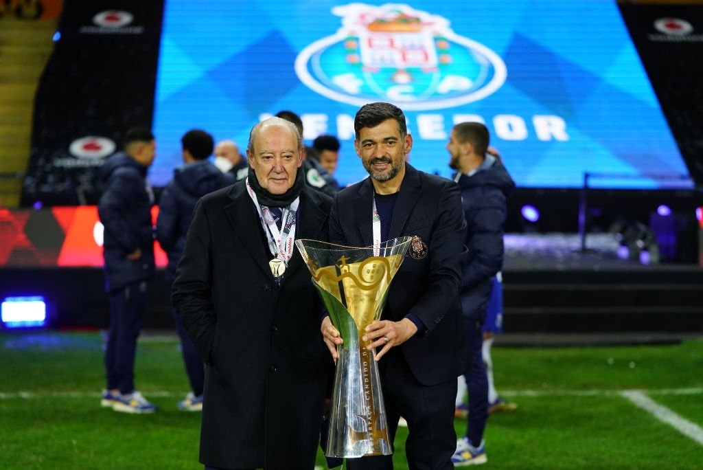 AVEIRO, PORTUGAL - DECEMBER 23: Sergio Conceicao of FC Porto and Jorge Nuno Pinto da Costa of FC Porto celebrate with trophy after winning the Portuguese Super Cup at the end of the Portuguese Super Cup match between FC Porto and SL Benfica at Estadio Municipal de Aveiro on December 23, 2020 in Aveiro, Portugal. (Photo by Gualter Fatia/Getty Images)