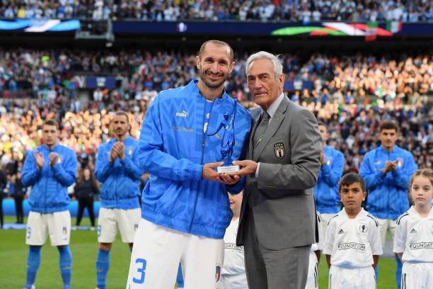 LONDON, ENGLAND – JUNE 01: Giorgio Chiellini of Italy receives an award before their final game for Italy from Gabriele Gravina, President of Italian Football Federation prior to the 2022 Finalissima match between Italy and Argentina at Wembley Stadium on June 01, 2022 in London, England. (Photo by Claudio Villa/Getty Images)