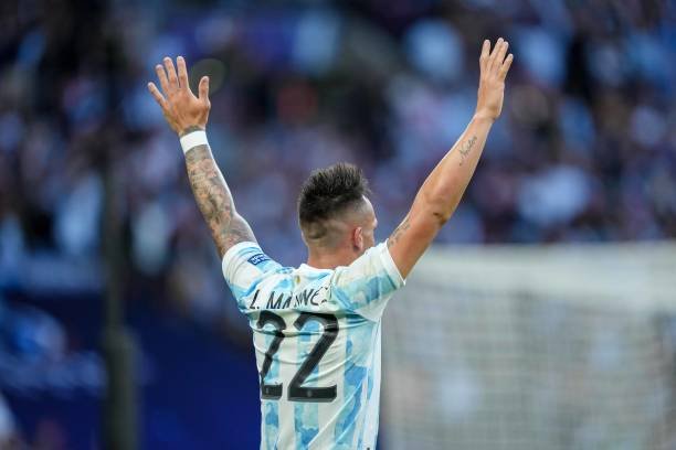 LONDON, ENGLAND – JUNE 01: Lautaro Martinez of Argentina celebrates after scoring during the Finalissima 2022 match between Italy and Argentina at Wembley Stadium on June 1, 2022 in London, England. (Photo by Gaston Szerman/DeFodi Images via Getty Images)