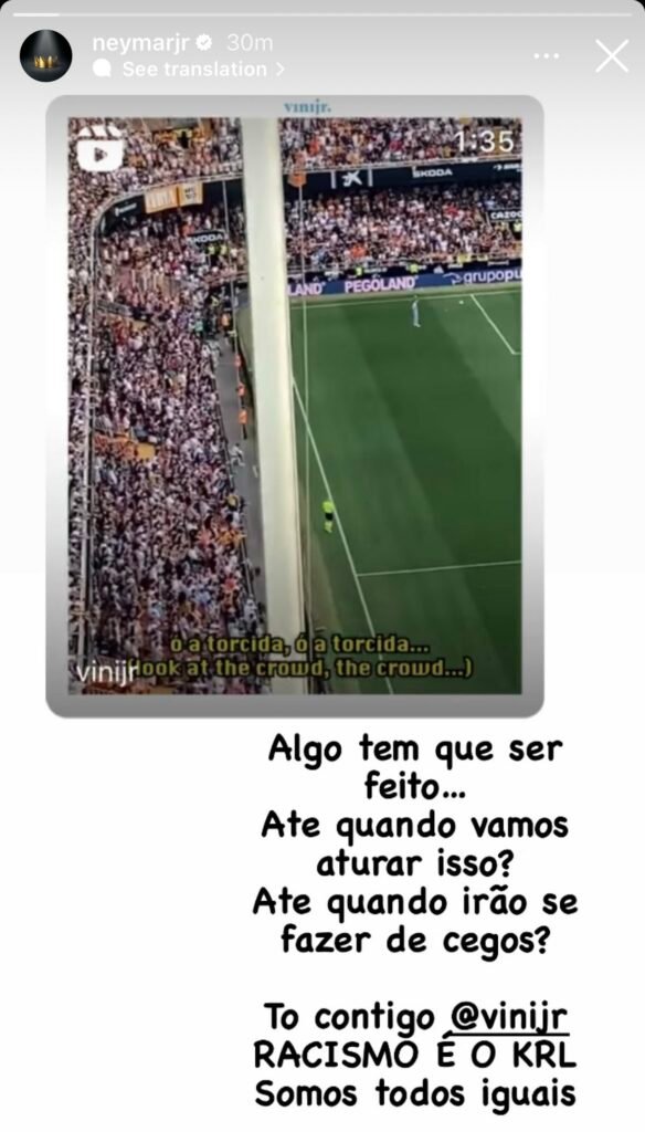 No entanto, o momento é outro. Em seu Instragram, Neymar demonstrou apoio para Vinícius Junior. O companheiro de seleção foi vítima de novo caso de racismo em Mestalla, na partida contra o Valencia.