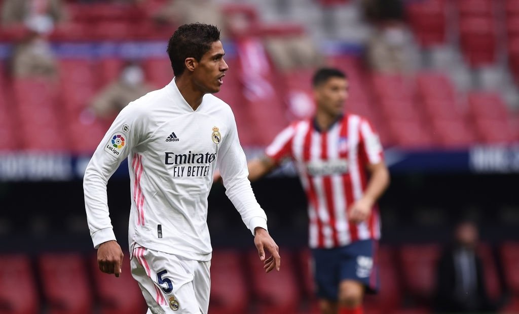 MADRID, SPAIN - MARCH 07: Raphael Varane of Real Madrid looks on during the La Liga Santander match between Atletico de Madrid and Real Madrid at Estadio Wanda Metropolitano on March 07, 2021 in Madrid, Spain. Sporting stadiums around Spain remain under strict restrictions due to the Coronavirus Pandemic as Government social distancing laws prohibit fans inside venues resulting in games being played behind closed doors. (Photo by Denis Doyle/Getty Images)