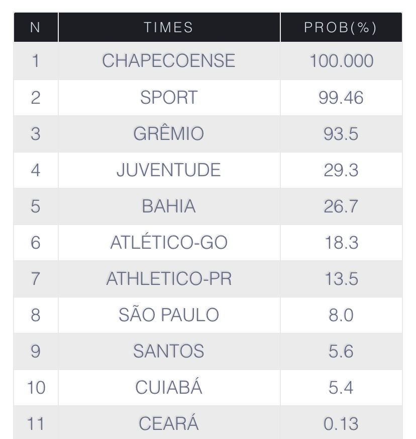 O São Paulo, outro gigante do futebol brasileiro que está próximo ao Z4, também reduziu suas chances de rebaixamento para 8% após derrotar o Palmeiras em pleno Allianz Parque. Já o Grêmio, que vive um péssimo e quase irreversível momento, já tem 93.5% de probabilidade de cair.