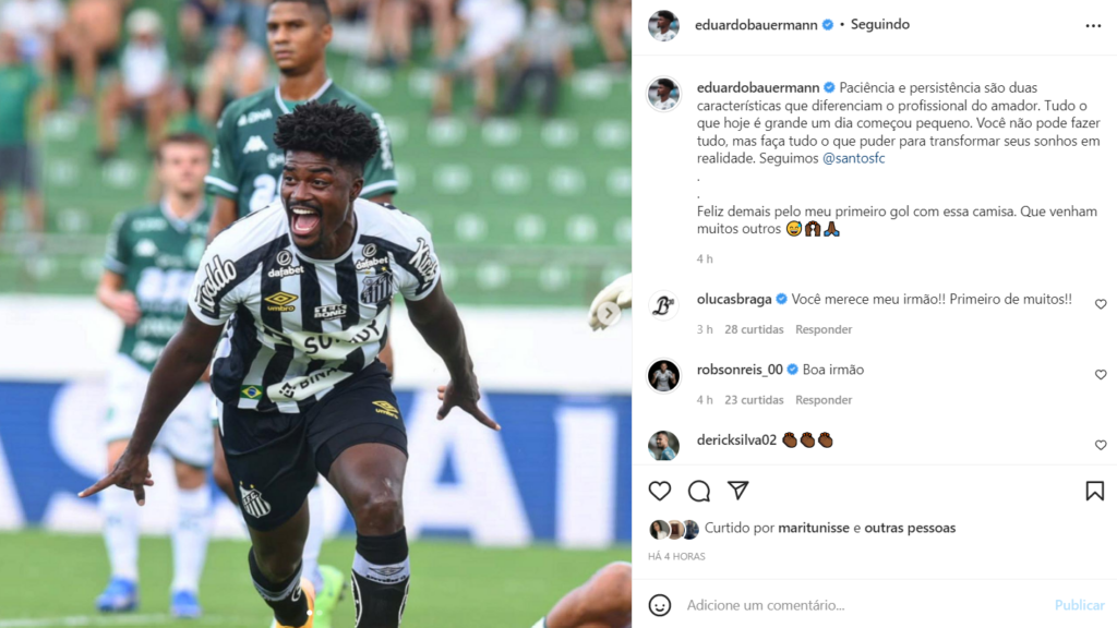 Em suas redes sociais, o defensor de 25 anos lamentou o placar, mas agradeceu Marcos Leonardo pela assistência e quer balançar as redes mais vezes pelo Peixe.