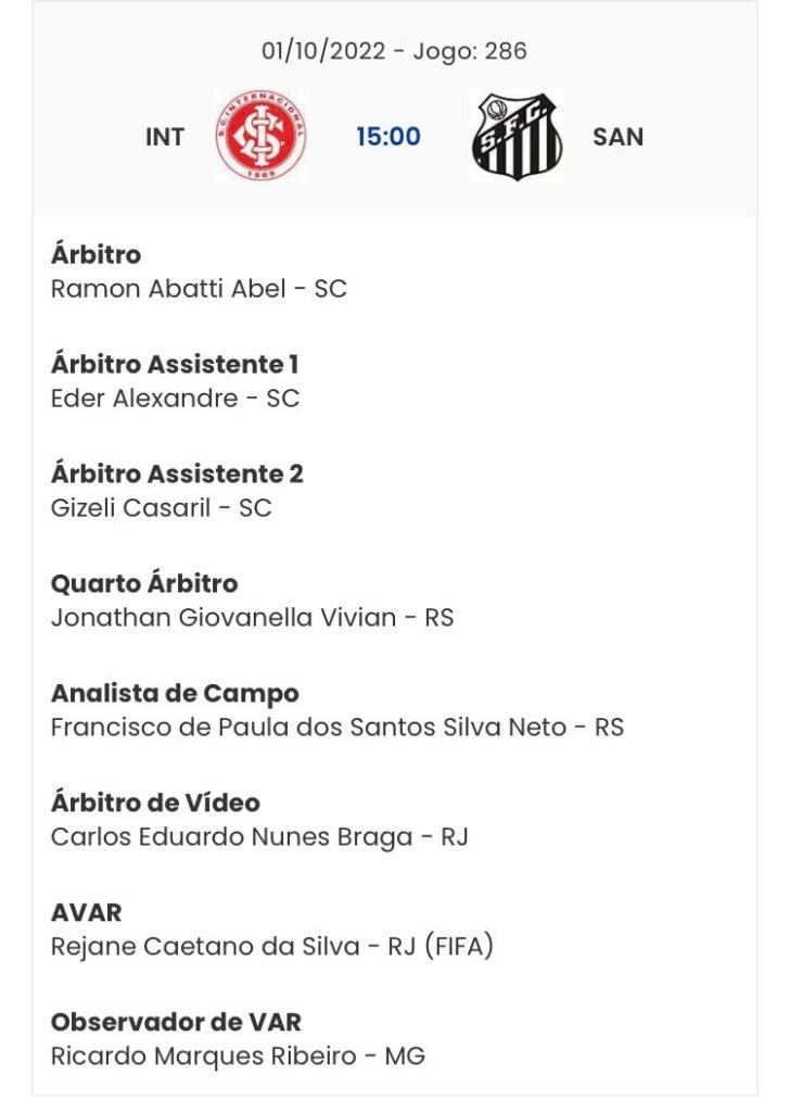 A CBF definiu a arbitragem que comandará a partida entre Santos e Internacional neste sábado (1º), às 15h, no Beira-rio, pela 29ª rodada do Campeonato Brasileiro.