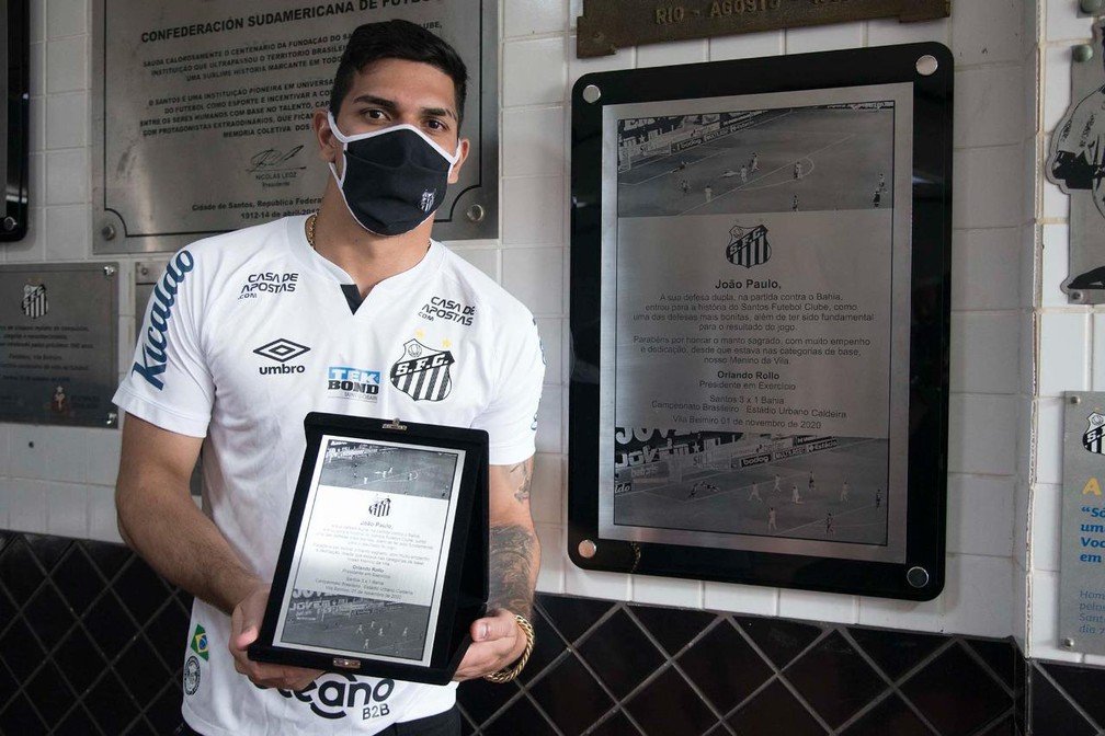 Com certeza o ano de 2020 será marcado para o goleiro João Paulo. De terceiro reserva à titular em 6 meses, João Paulo chamou a atenção com boas defesas e, no jogo contra o Bahia, duas defesas em sequência lhe renderam uma homenagem da diretoria santista, que lhe entregou uma placa na Vila Belmiro na tarde desta terça-feira. As defesas aconteceram no jogo contra o Bahia, onde o jogador de forma espetacular fez duas defesas em sequência, a primeira de um chute à distância do meia Welder, onde João Paulo acabou soltando a bola para a lateral, e na sequência, Gilberto pegou o rebote do goleiro e chutou, obrigando João Paulo se esticar todo e fazer a segunda defesa no mesmo lance.