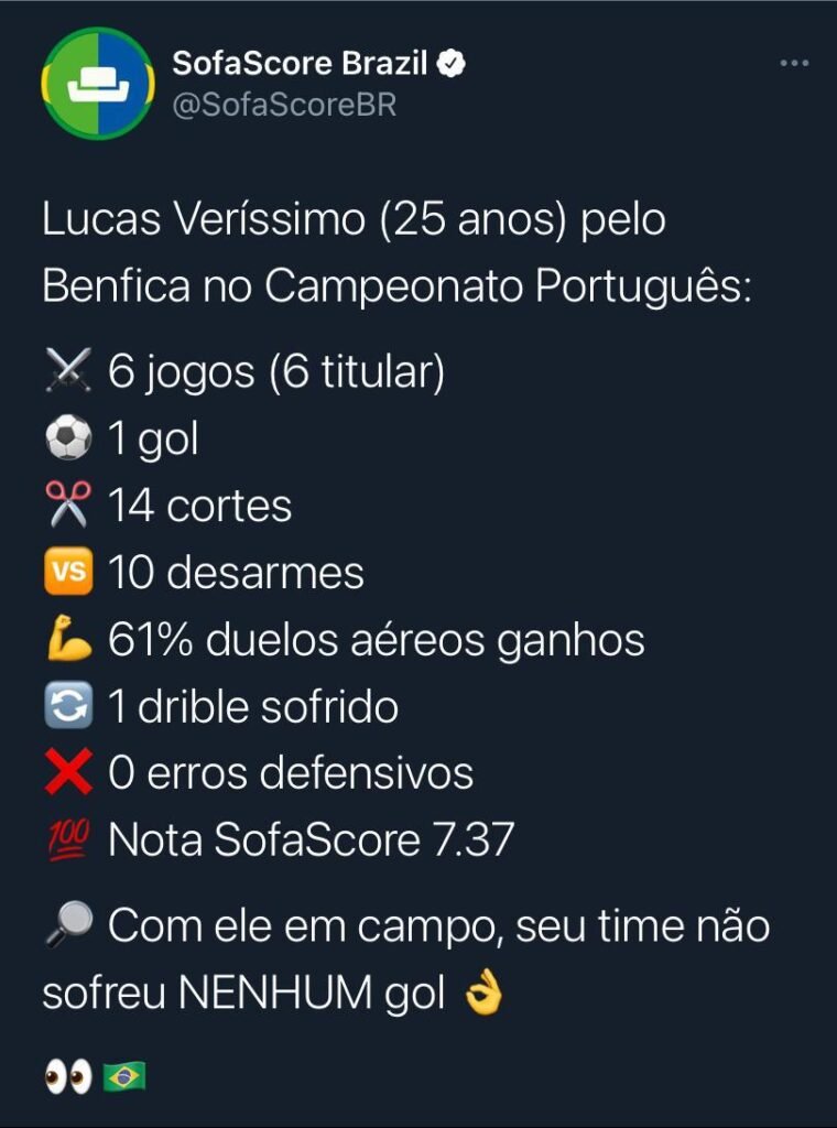 Ex-Santos, Lucas Veríssimo vive um ótimo momento atuando pelo Benfica (POR). O zagueiro vem colecionando boas atuações e ótimos números pelo clube português.