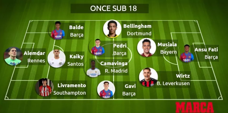 O time do jornal Marca também conta com grandes promessas de gigantes europeus, como: o meia Camavinga, do Real Madrid (ESP) e os atacantes Bellingham, do Borussia Dortmund (ALE), Jamal Musiala, do Bayern de Munique (ALE) e Ansu Fati, do Barcelona (ESP).