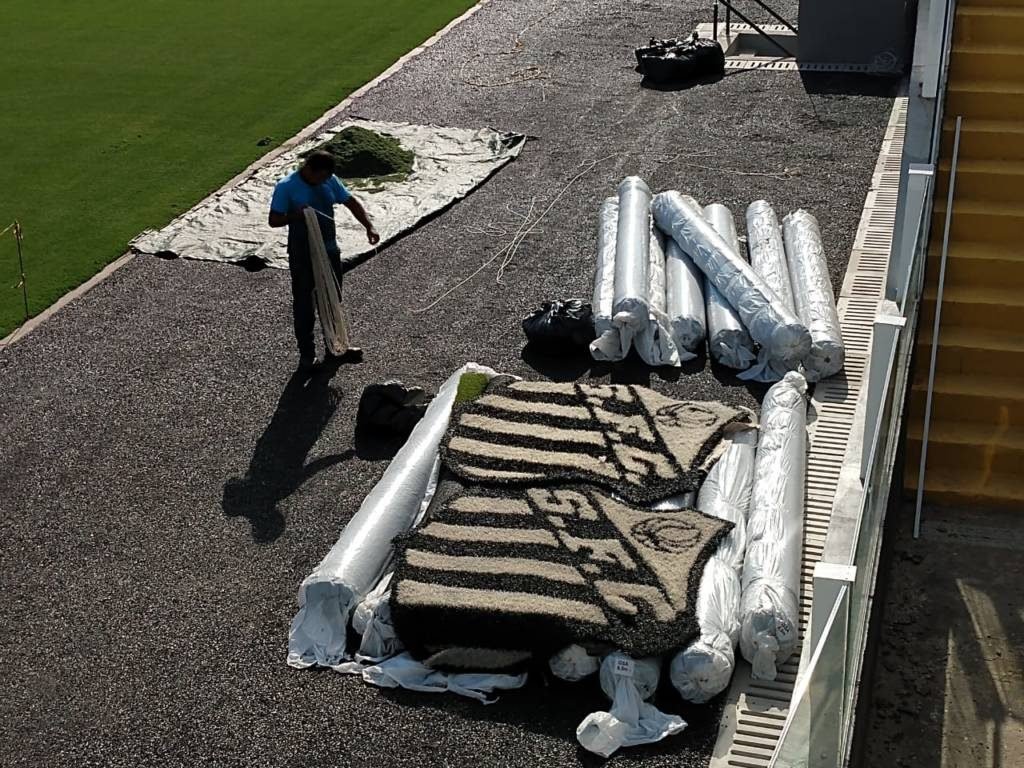 Colocação da grama artificial e do escudo do Santos atrás dos gols (Gazeta Esportiva).