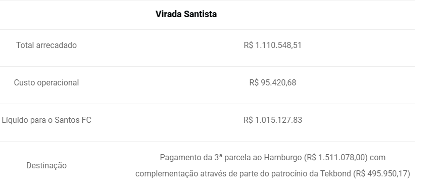 A diretoria santista publicou no Portal da Transparência do Santos, os valores que as ações Virada Santista e Ingresso Virtual gerou, e ainda mostrou no que foi utilizado os valores. A Vaquinha Virtual, rendeu R$ 1.010.127,83 e, inicialmente seria destinado para o acerto com o Atlético Nacional. A diretoria mudou os planos, pegou o valor e junto ao patrocínio da TekBond, de R$ 495.950,17, contabilizou R$ 1.511.078,00 e o valor foi utilizado para pagar a terceira parcela do acordo com o Hamburgo, pela compra do zagueiro Cléber Reis.