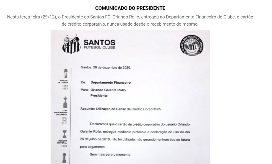 O presidente Orlando Rollo, como havia prometido quando assumiu a posição de comandante do Santos no lugar de José Carlos Peres, não fez uso nenhum do cartão corporativo do clube e o devolveu sem gerar custos ao Santos.