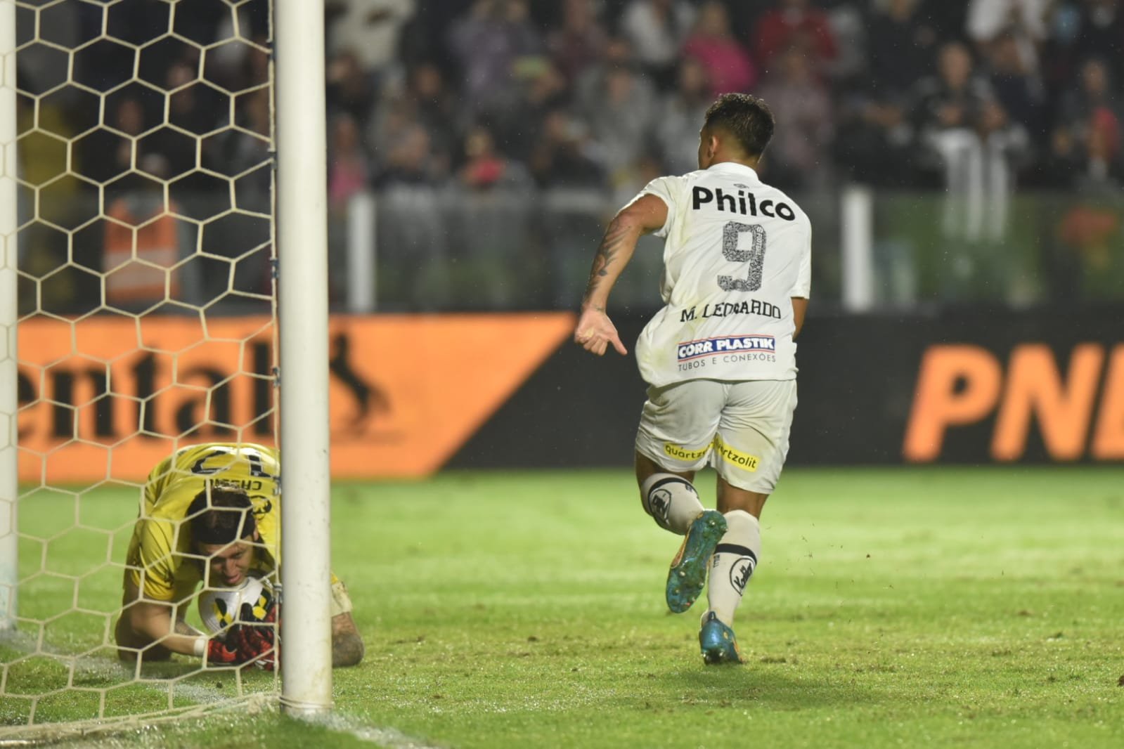 O atacante Marcos Leonardo saiu em defesa do goleiro Cássio que sofreu uma tentativa de agressão de um torcedor que invadiu o gramado da Vila Belmiro no jogo entre Santos e Corinthians, pela Copa do Brasil.