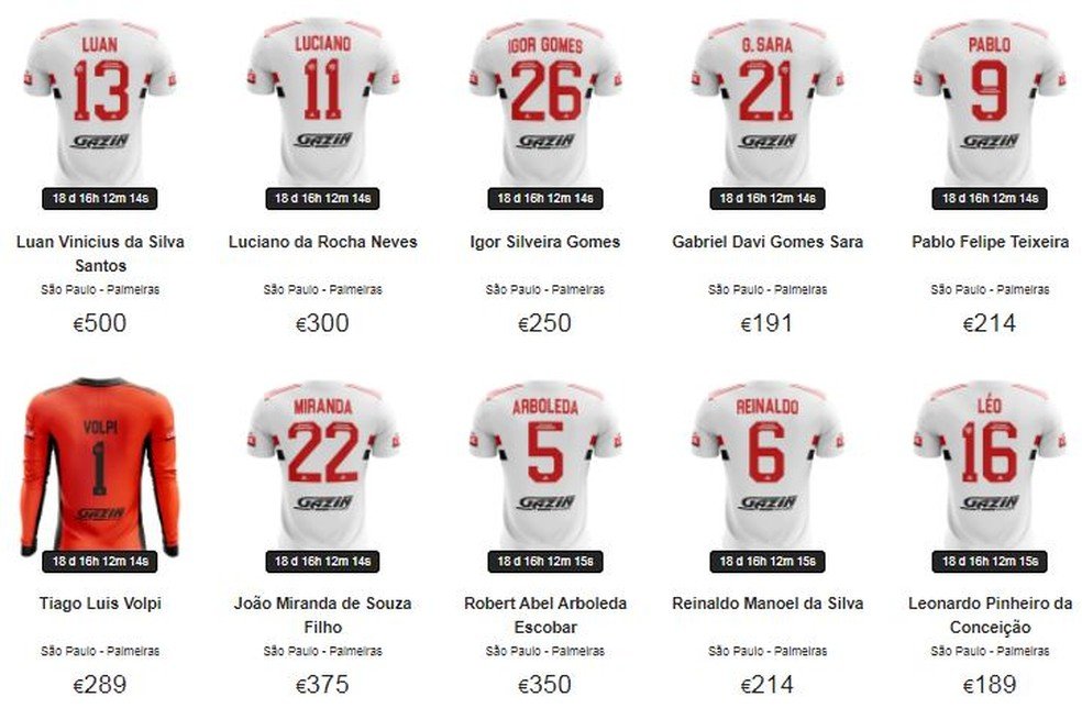 A camisa mais cobiçada a do volante Luan, autor do primeiro gol do São Paulo diante do Palmeiras. O uniforme do camisa 13 estava valendo cerca de 500 euros (R$ 3,2 mil na cotação atual). Outra mais querida pelos torcedores é a de Luciano, que já havia recebido um lance de 300 euros (R$ 1,9 mil).