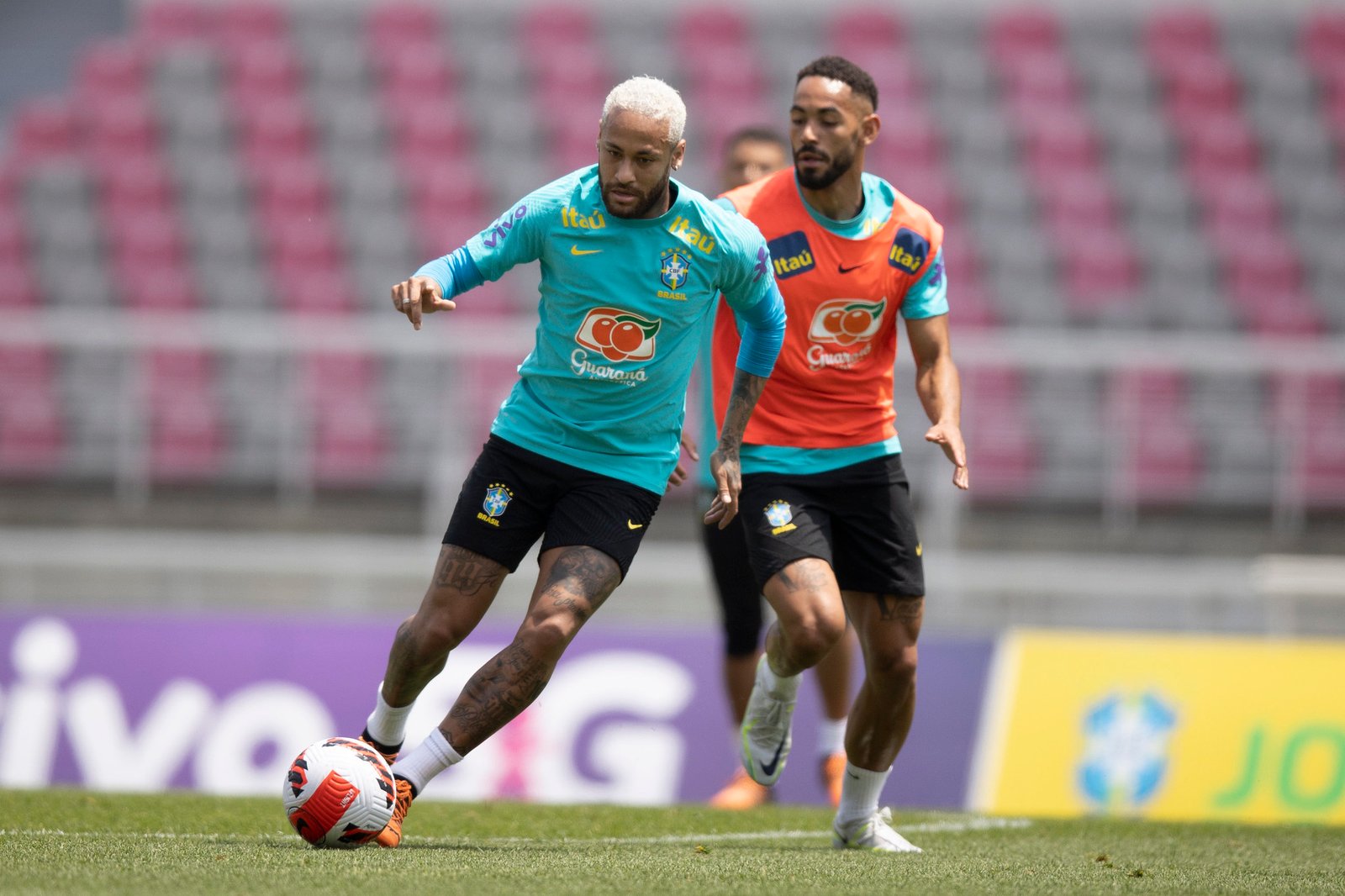 O grupo ainda não está 100%, mas o treinador dividiu os jogadores em dois times e, em um deles, usou o quarteto Gabriel Jesus, Richarlison e Lucas Paquetá. Cotado para ser titular, Vinícius Jr. ainda não se apresentou à seleção por conta da final da Champions League.