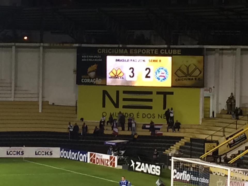 Na raça! Foi assim que o Criciúma venceu o Bahia na noite desta terça-feira (14/06) pelo placar de 3 a 2. O Tigre saiu atrás do placar duas vezes, perdeu um pênalti com Elvis mas não deixou de lutar até o fim . Aos 37 do segundo tempo, Hélio Paraíba acabou com o embate, aproveitou o cruzamento e decretou a vitória tricolor. O atacante Gustavo marcou duas vezes e foi foi expulso no fim do duelo em uma tentativa de roubada de bola do goleiro.