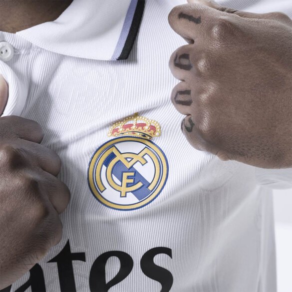 Que camisa sensacional! A combinação do branco com lilás é sensacional, além do escudo do Real Madrid em alto relevo ao longo do uniforme. Muito linda.
